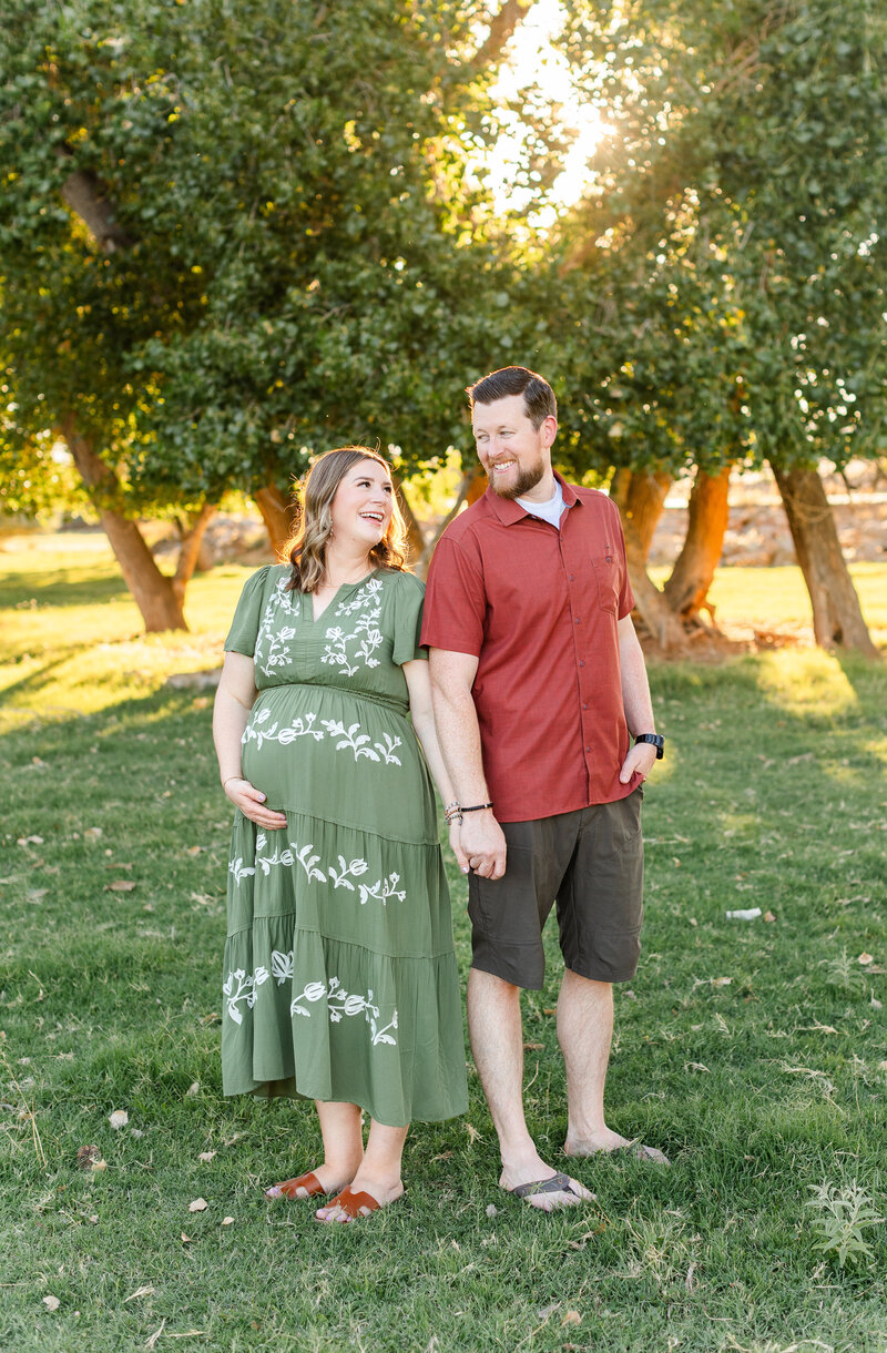 When you book your maternity photos in St. George, I will guide you through your outfit selection. Most clients like to wear dresses. These are usually very flattering, but allow enough attention to be drawn to your cute baby bump. I recommend selecting fabrics that are cotton, gauze, and that have a nice flow to them. I recommend avoiding stretch cotton or spandex as these often don't photograph as well or are as flaterring.